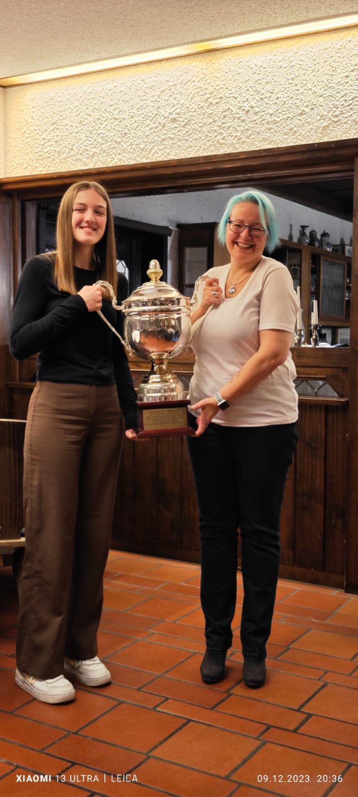 Auch wurde der große Wanderpokal mit fertiggestellter Plakette den Siegern des Weihnachtsturnieres Kathy und Sabrina überreicht..