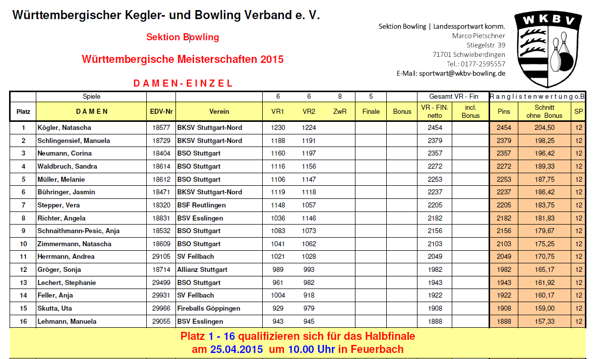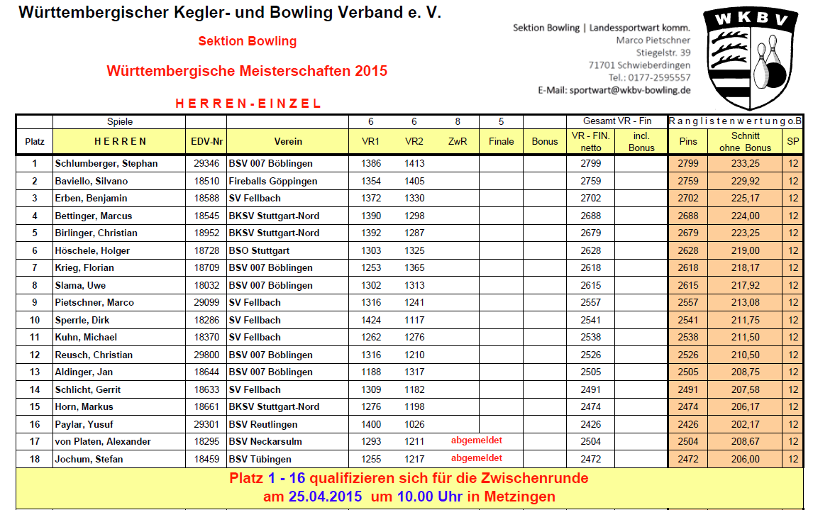 Leider wurde die Leistung der beiden nicht belohnt. Am Ende war es Platz 9 in der Vorrunde, aus der die besten 8 in die Zwischenrunde einzogen. Besonders bitter war der Abstand zum 8., es war genau 1 Pin !!!
